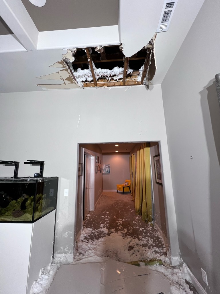 The pipe is in the ceiling and runs along an exterior wall – a recipe for disaster. But at least it missed the fish tank!