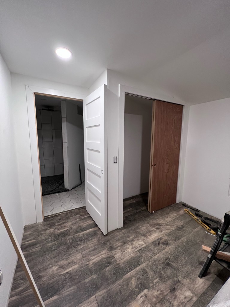 In the last month, we’ve gotten all the flooring in and doors hung. The vanity top – which was cracked in half when we opened the box – has also been replaced.