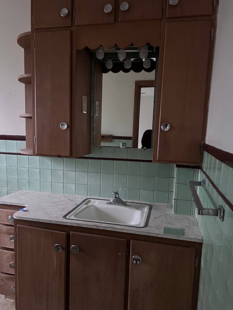 Upstairs, the bathroom and kitchen definitely scream 1950s – complete with plastic tile! I was disappointed to discover that funky mint tile was mere marbled plastic. I had fleeting thoughts of repurposing that tile, but oh well.